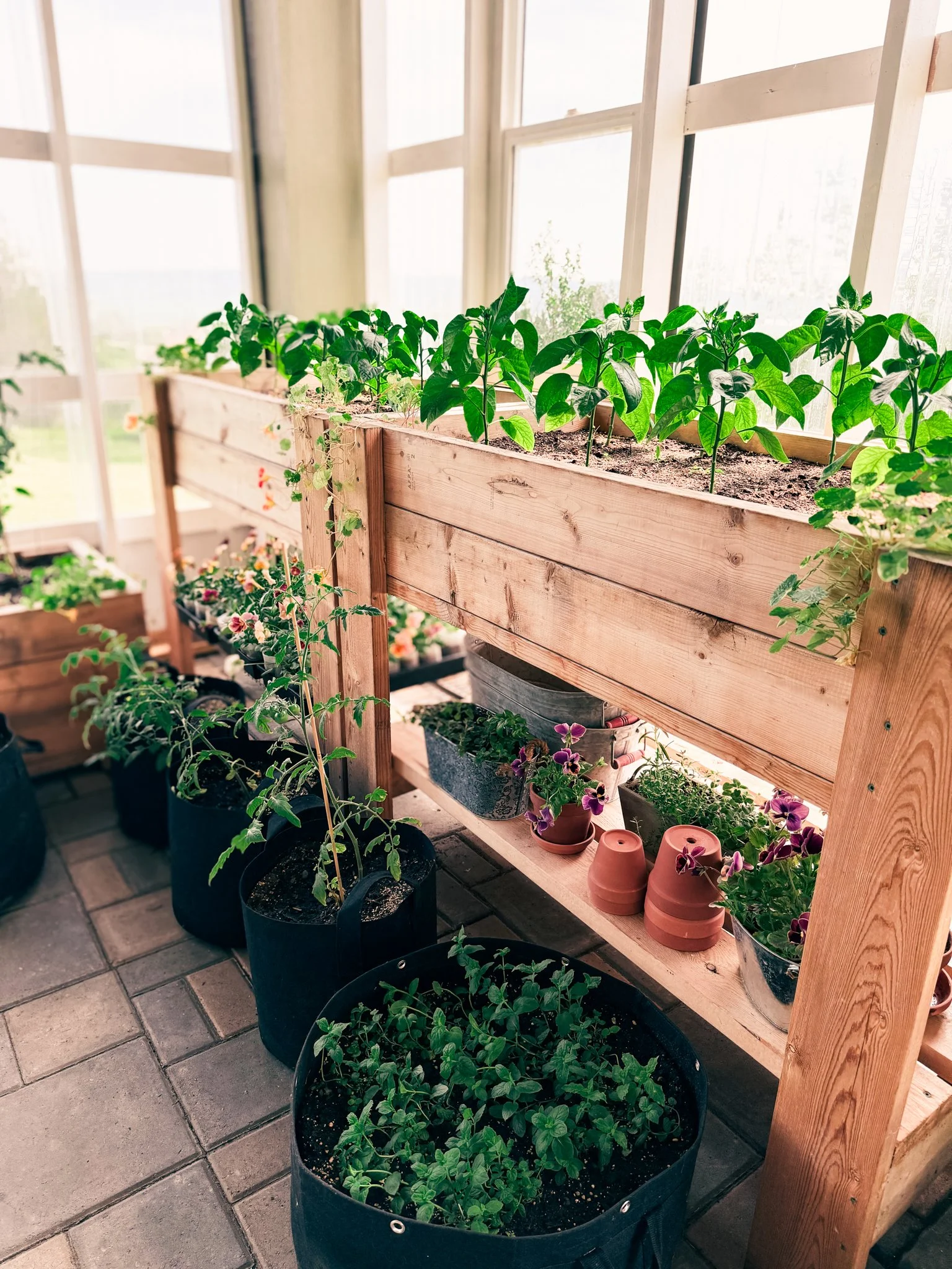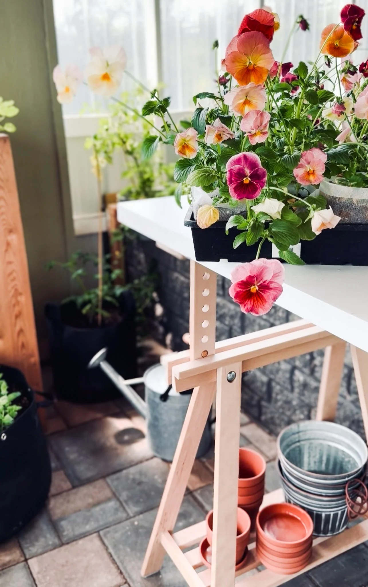 Pansies were another edible flower I cultivated in our greenhouse. Since they thrive in partial shade, I placed them on shelves under the raised beds, which also encourages longer stems—making them perfect for floral displays.